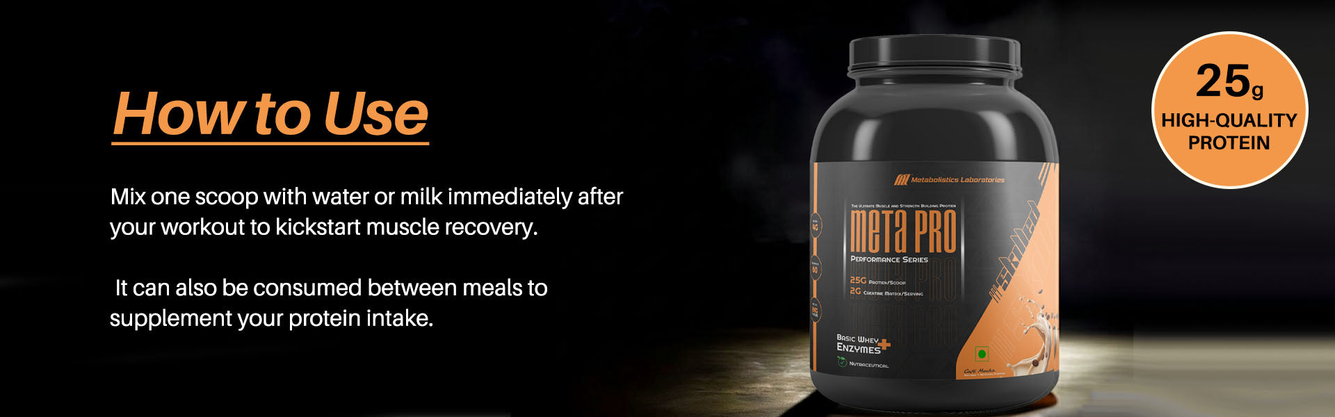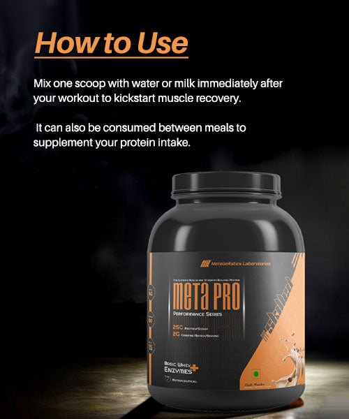 Mix one scoop of Meta Pro Whey Protein with 200–300ml of water or milk. For best results: